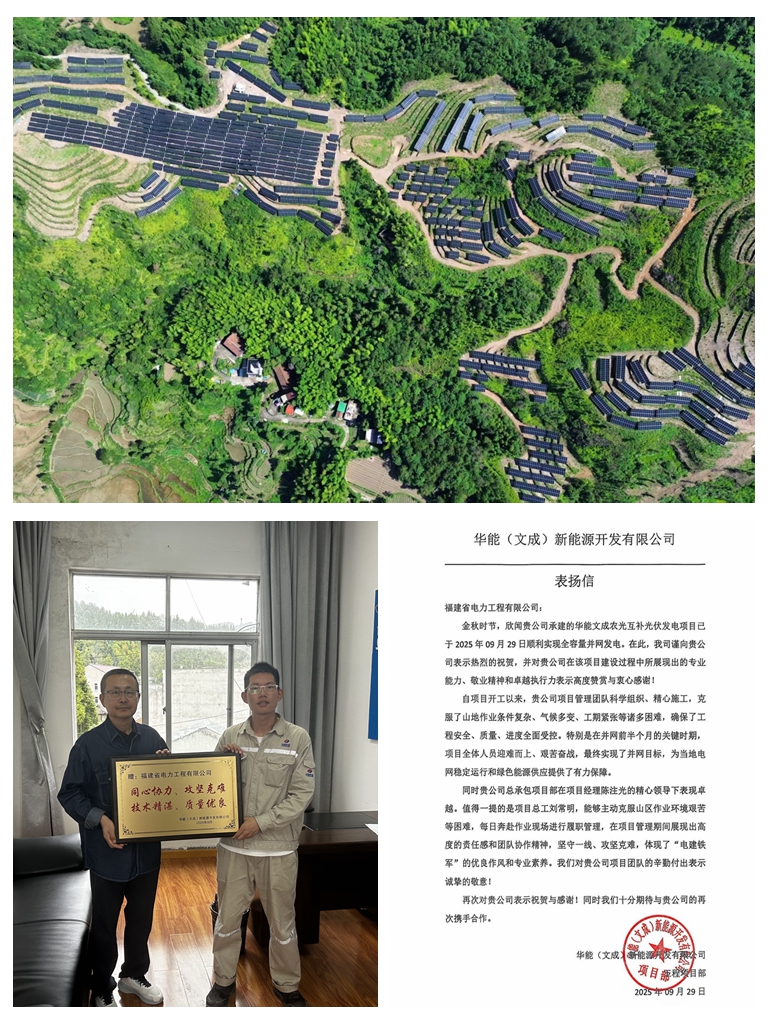 | 日前,福建公司多项目相继投产,以扎实的建设成果为国家能源战略推进和绿色低碳发展注入新动能,献礼祖国76周年华诞。 9月15日,福州福清虎溪T接城溪、溪头T接林虎脱开进塘头变110千伏线路成功送电,改工程新建线路总长6.248公里,采用单回、双回架空及电缆混合方式建设,建成后,有效完善了福清东部片区及洪宽工业园区的电网结构,显著提升区域供电可靠性与安全性。项目团队在施工过程中克服多项技术难点,严格执行安全管理要求,最终圆满达成送电目标。 9月29日,华能文成农光互补光伏发电项目实现全容量并网,该项目位于浙江省文成县,场址总面积约573.72亩,总装机容量23兆瓦,共使用N型双面双玻组件37176块。项目充分利用山地光照资源,采用“农光互补”模式,实现土地集约化利用,兼顾发电效益与生态保护,对推动能源结构转型、助力实现“双碳”目标具有积极意义。项目团队面对工期紧张、环境复杂等多重挑战,科学规划、精细管理,保障工程高质量如期投运。 9月29日,赤城县200兆瓦风储一体化创新示范工程实现全容量并网发电,标志着河北“风储”一体化能源体系建设取得突破性进展,也为京津冀地区绿色能源保供与河北省“双碳”目标推进再添新动能。该项目位于河北张家口赤城县,建设用地约1572亩,装机容量200兆瓦,以8回集电线路接入新建的220千伏升压站,以1回220千伏送出线路接入深能蚂蚁洼升压站。建成后,对推进区域生态保护及修复,促进绿色产业与生态保护融合发展,壮大县域经济,增加群众收入,助力乡村振兴具有重大意义。 项目的成功投产,不仅体现了公司在新能源和电网建设领域的专业能力,也为推进能源绿色转型、助力“双碳”目标实现贡献了重要力量。公司将以更昂扬的斗志、更务实的作风,匠心打造更多优质工程、精品工程,在祖国繁荣发展的征程中,持续贡献电建力量! | |||||